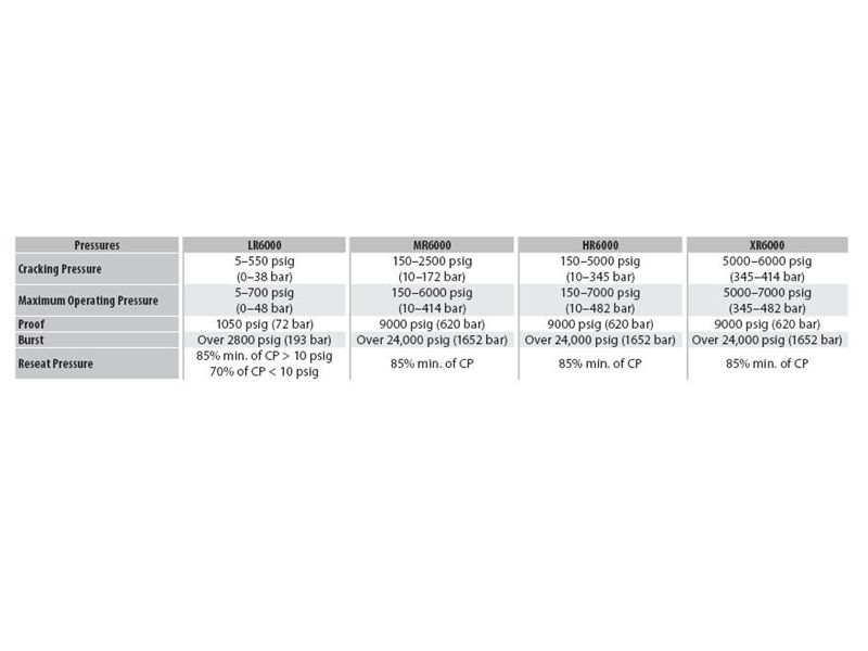 Available in low, medium, high and extra high pressure models, R6000 right angle relief valves provide users with high accuracy and consistency of cracking and reseat pressures. Furthermore, narrow pressure ranges (cracking pressures) for each model can be factory pre-set according to customer specifi cations. PED certifi cation and CE marking are standard for all models. All R6000 relief valves are off ered with multiple end connections to ensure application versatility.